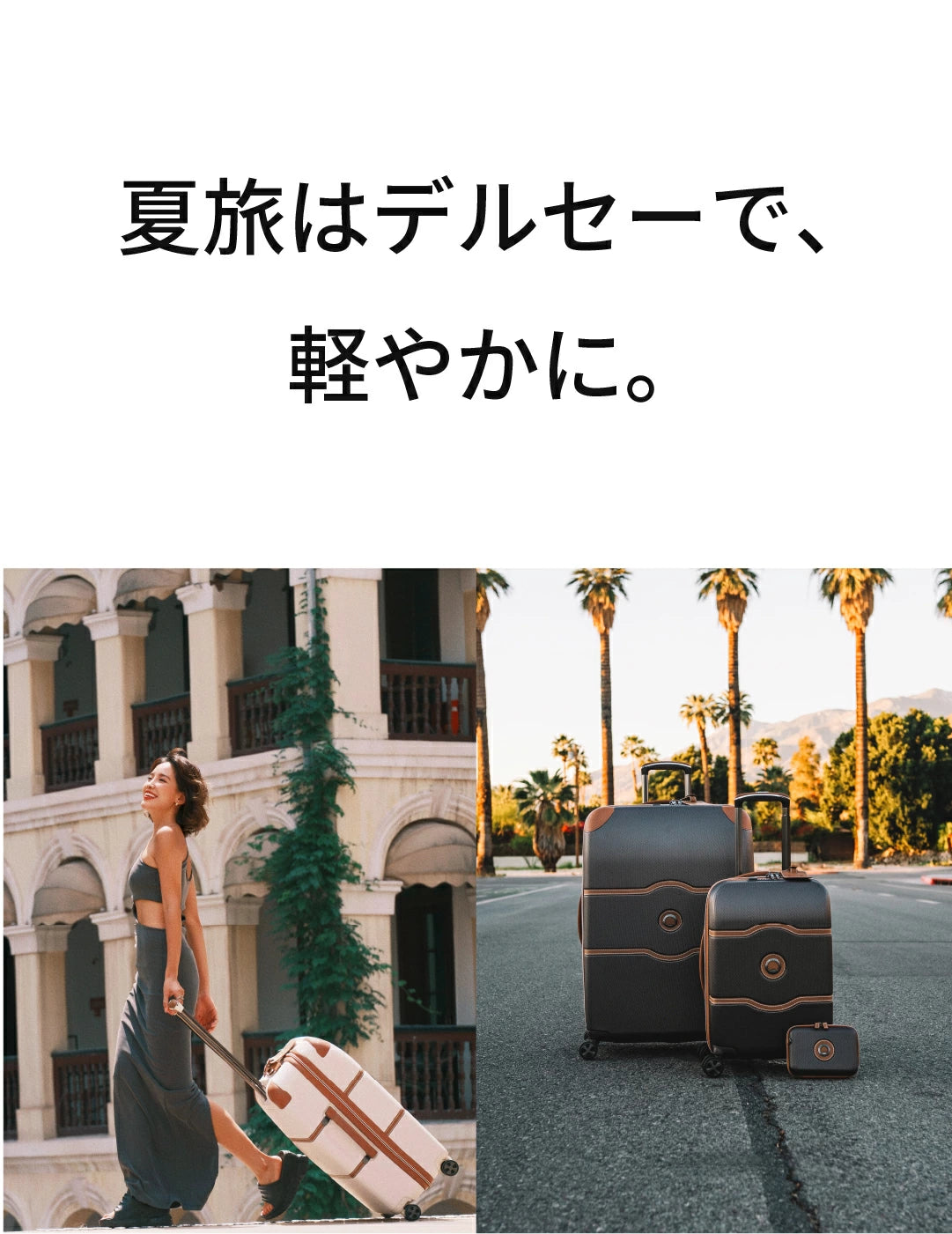 DELSEYは、多彩なカラー、豊富なサイズ展開、幅広い価格帯で、あなたの旅のスタイルに寄り添います。軽量モデルから大容量タイプまで、ビジネスにもレジャーにも最適なスーツケースを取り揃えています。洗練されたデザインと高い機能性で、快適な旅をサポート。